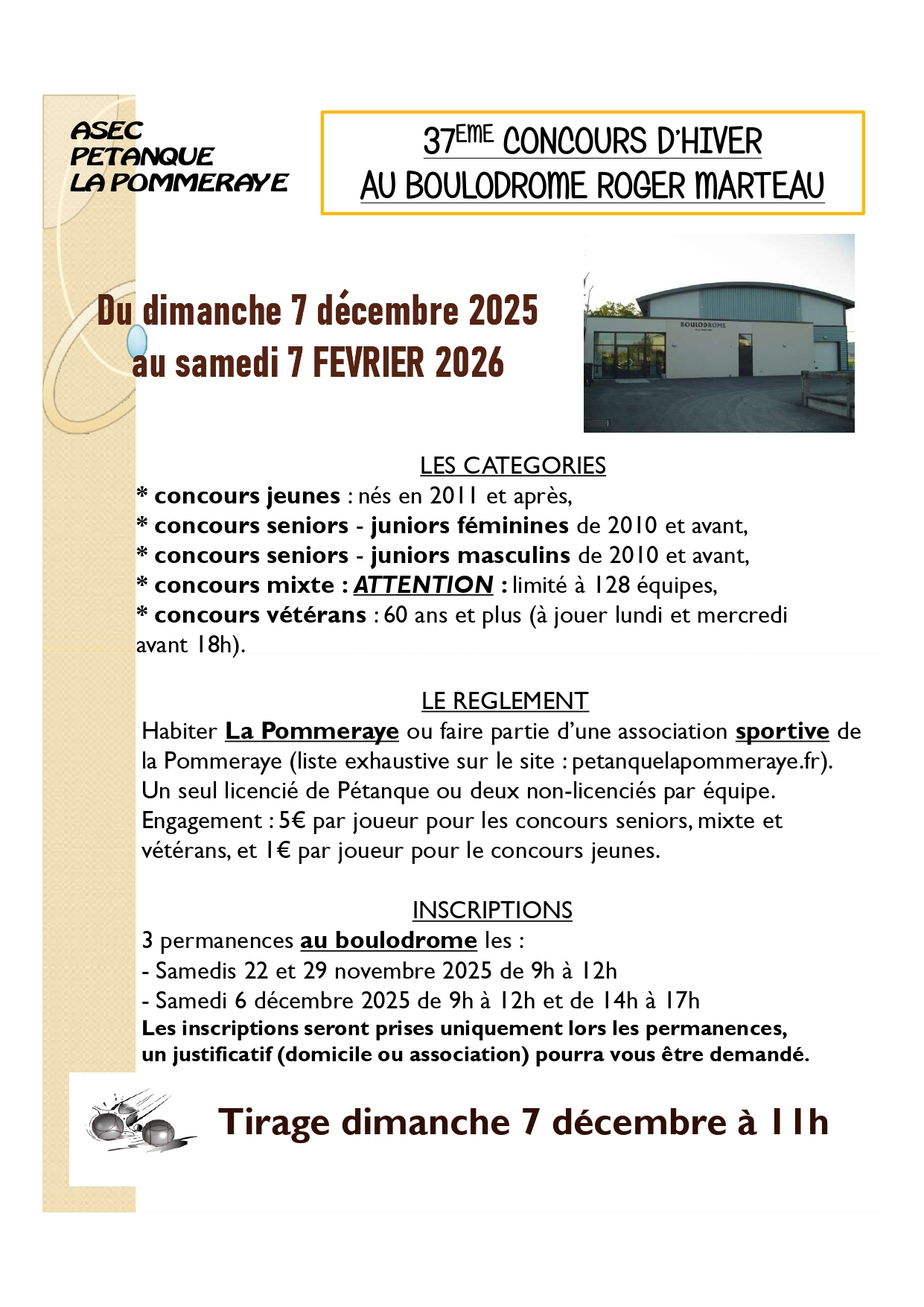 Petite précision qui n'est pas explicite sur l'affiche, il suffit qu'un des 2 joueurs respecte les conditions d'habiter ou de faire partie d'une association sportive (sauf pour les licenciés pétanque d'un autre club que La Pommeraye ou Montjean qui doivent en plus jouer avec un habitant de la Pommeraye)